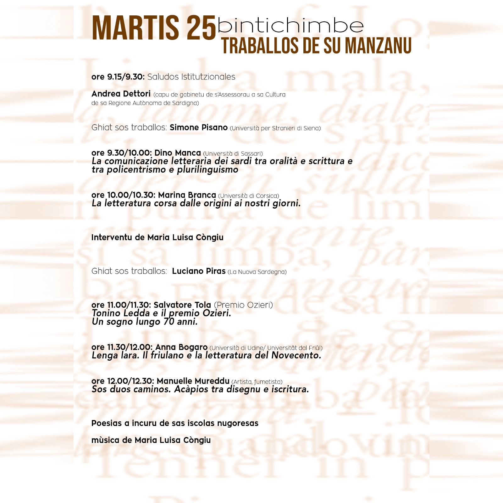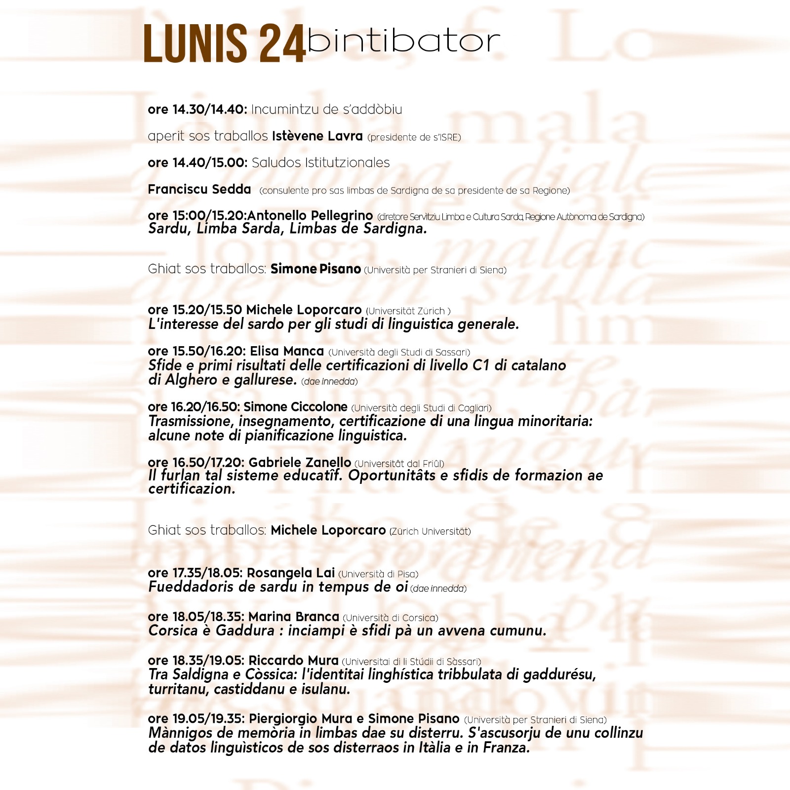 Un focus particolare sarà dedicato al sardo (e alle altre lingue di Sardegna), alla loro documentazione, all’elaborazione di strumenti scientifici per la certificazione delle competenze linguistiche, nonché, infine, alla presenza del sardo e delle altre lingue di Sardegna nella scuola, nei panorami linguistici, nella stampa e nei media radio-televisivi. Nella mattina del 25 novembre si porrà l’attenzione sui sistemi letterari e la letteratura in lingua sarda, corsa e friulana. Durante la riflessione sulle letterature, a cui parteciperanno le scuole del territorio, si ricorderà anche la figura di Tonino Ledda fondatore del premio Ozieri che, ormai settant’anni fa, ha sancito la pluralità e la modernità della letteratura nelle lingue di Sardegna.