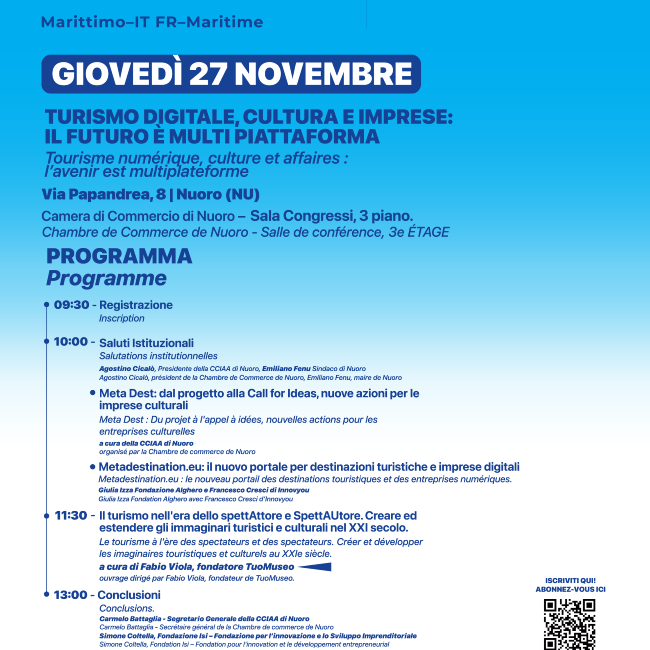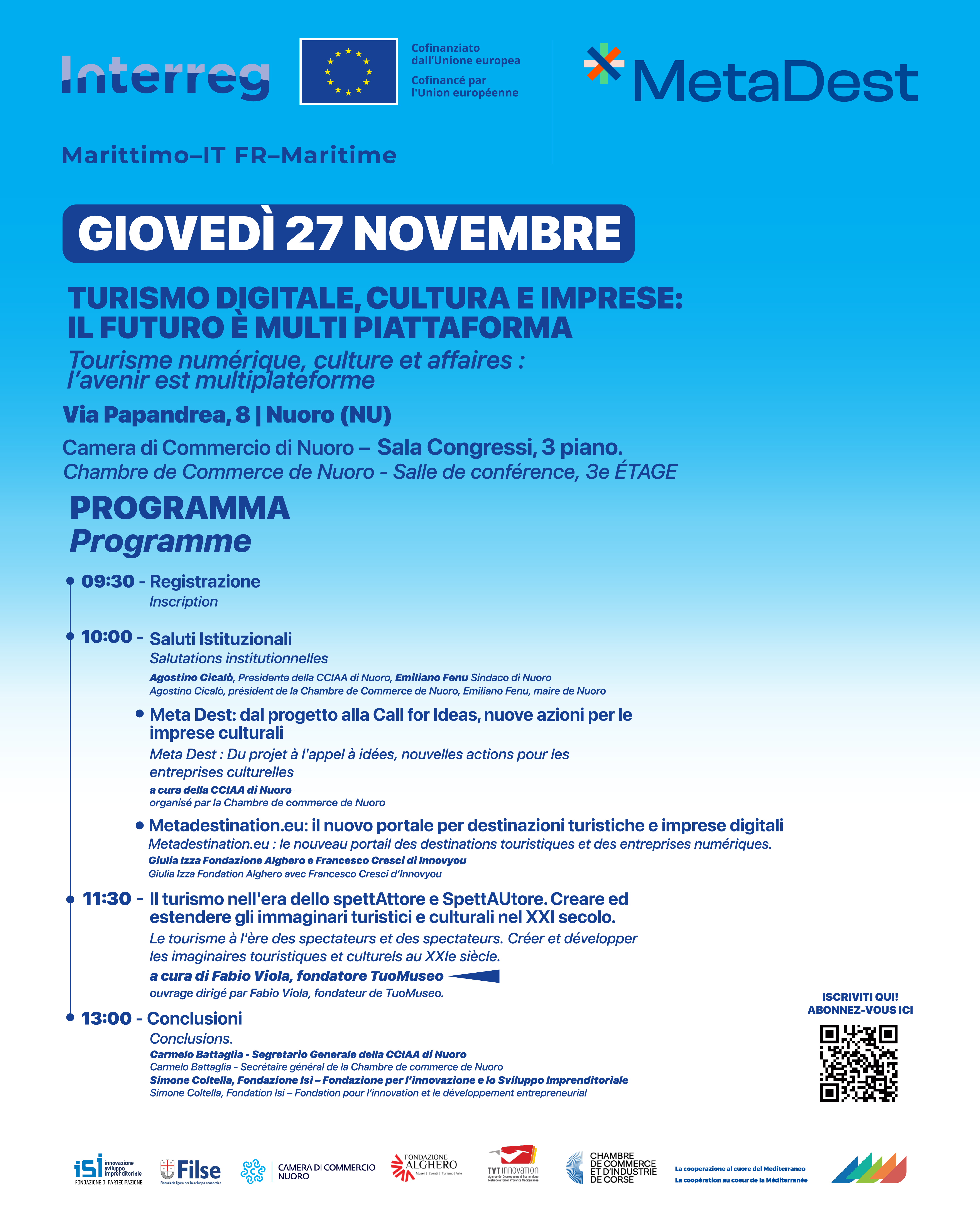 La Sala Convegni della CCIAA di Nuoro ospiterà Giovedì 27 novembre, alle ore 930, l'evento aperto al pubblico dal titolo "Meta – Dest Turismo Digitale, Cultura e Imprese: il Futuro è Multi Piattaforma", dedicato alla presentazione delle nuove attività del progetto META-DEST - La Destinazione Multi-Piattaforma per l’Innovazione del Turismo e, soprattutto, l'atteso intervento di Fabio Viola, fondatore di TuoMuseo, dal titolo "Il turismo nell'era dello spettAttore e SpettAUtore. Creare ed estendere gli immaginari turistici e culturali nel XXI secolo".