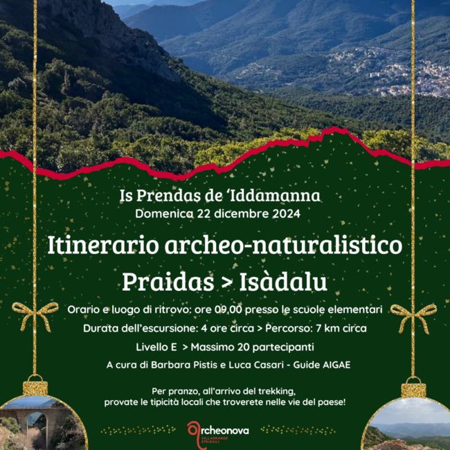 In occasione della manifestazione Is Prendas de 'Iddamanna, attesa manifestazione organizzata dalla Proloco di Villagrande Strisaili, la società Archeonova propone una suggestiva escursione nel nostro bellissimo territorio. L’itinerario prevede un percorso ad anello, non particolarmente impegnativo, di circa 7 km che si svolgerà nell’arco di un’intera mattinata.